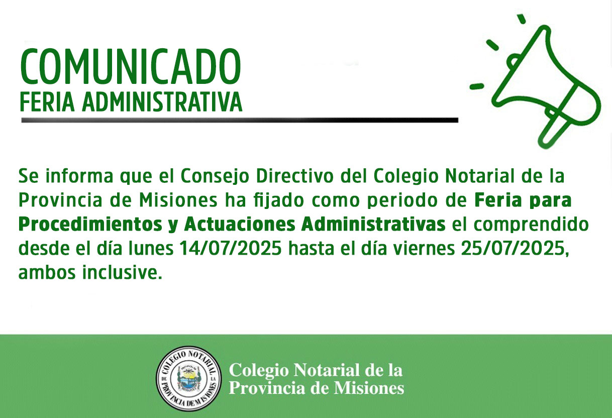 Se informa que el Consejo Directivo del Colegio Notarial de la Provincia de Misiones ha fijado como periodo de Feria para Procedimientos y Actuaciones Administrativas el comprendido desde el día lunes 14/07/2025 hasta el día viernes 25/07/2025, ambos inclusive.